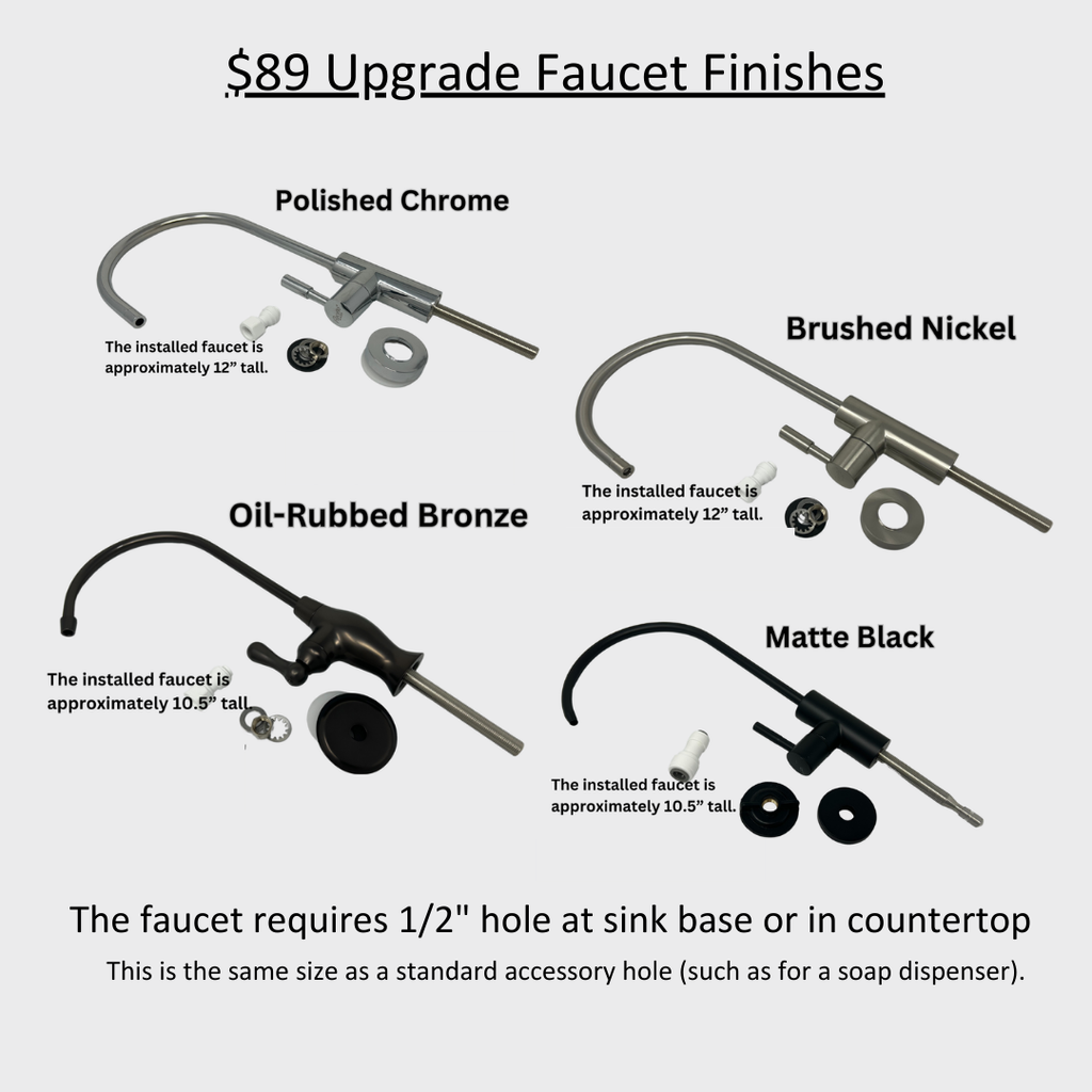 Secondary accessory faucets in a variety of faucet finishes are available if a separate dispensing faucet is desired. The onboard solid brass compression fittings also work well with standard PET plastic tubing that couple well to these accessory delivery faucets. All needed faucet components are included with the optional faucet.